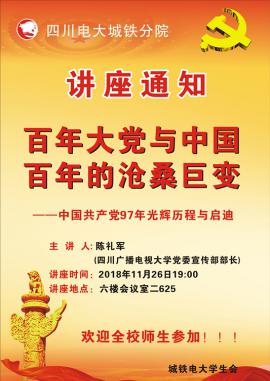 城铁电大举办《近现代史纲要》专题讲座 为进一步激发当代电大学员爱国热情,凝聚城铁学子共同的价值追求,提高思想政治意识,11月26日晚,城铁电大举办思想政治教育专题讲座,以百年大党与中国百年的沧桑巨变